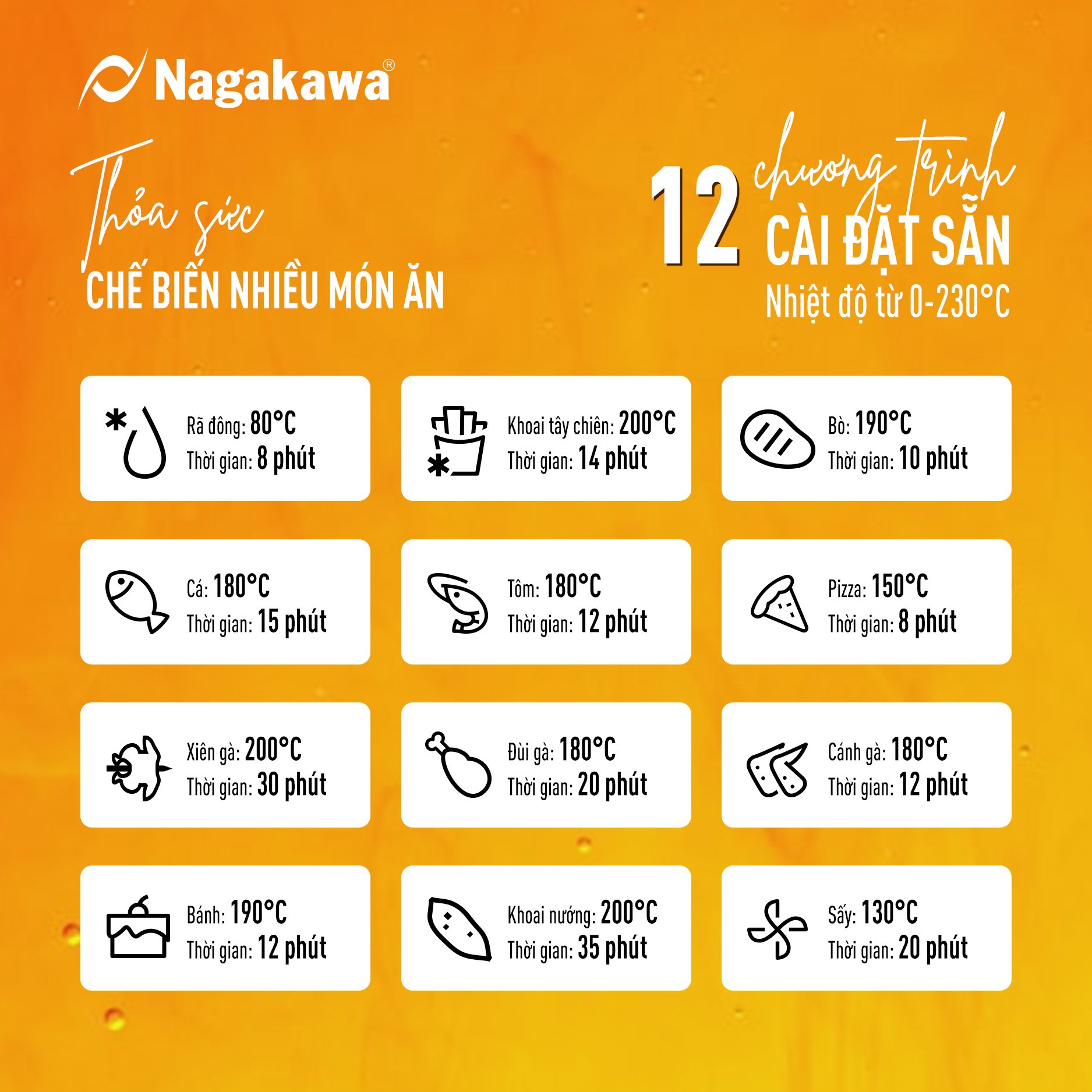 Nồi chiên không dầu Nagakawa NAG3306 bao gồm 12 chương trình nấu cài đặt sẵn, bao gồm: Rã đông | Khoai tây chiên | Bò | Gà | Tôm | Pizza | Xiên gà | Đùi gà | Cánh gà | Bánh | Khoai nướng | Sấy