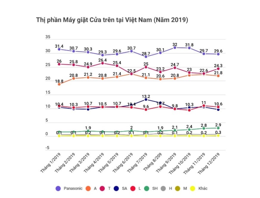 Trong đó, doanh số máy giặt cửa trên của Panasonic cán mốc cao nhất trong hai tháng 9 và tháng 10/2019 và có một sự giảm nhẹ nhưng không đáng kể trong hai tháng cuối năm nhưng cũng tương đương với doanh số của hãng trong mùa cao điểm về máy giặt.