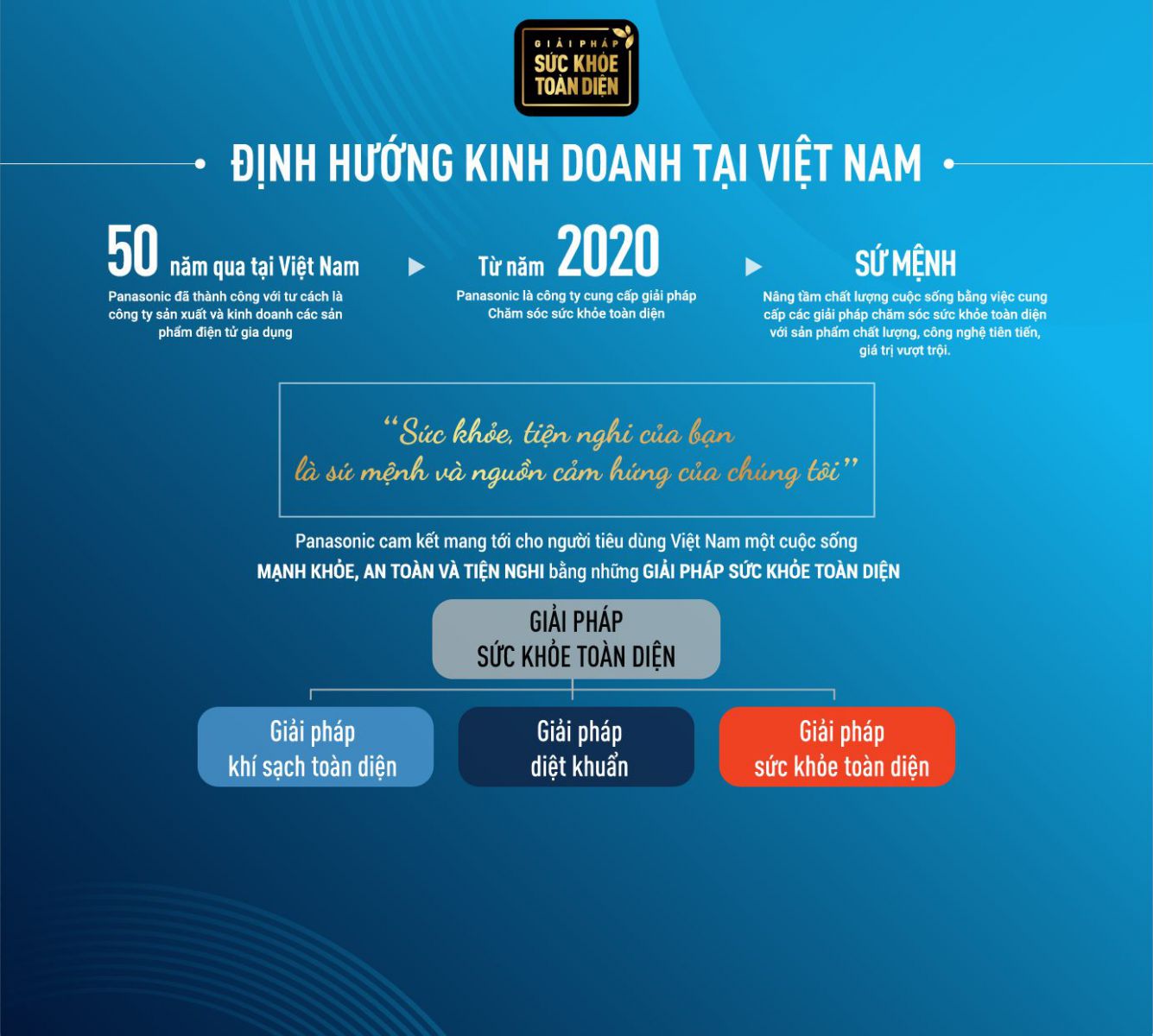 Ngày 16/10/2020, Panasonic Việt Nam đã công bố định hướng phát triển kinh doanh mới: chuyển từ Công ty sản xuất các sản phẩm điện tử gia dụng thành Công ty cung cấp các giải pháp chăm sóc sức khỏe toàn diện và ra mắt BỘ GIẢI PHÁP SỨC KHỎE TOÀN DIỆN, xác định tầm nhìn chiến lược, dẫn đầu xu hướng phát triển công nghệ xoay quanh yếu tố con người với phương châm “SỨC KHOẺ, SỰ TIỆN NGHI CỦA BẠN LÀ SỨ MỆNH VÀ NGUỒN CẢM HỨNG CỦA CHÚNG TÔI”