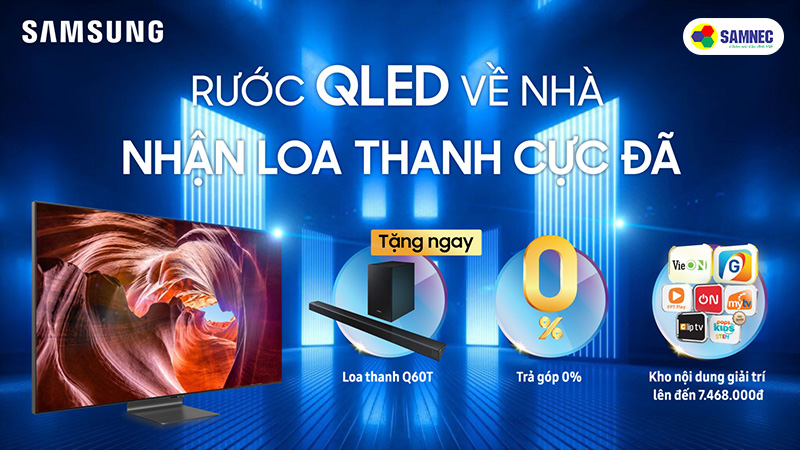 Trong khoảng thời gian từ 16/06/2020 đến 03/08/2020, khi khách hàng mua smart Tivi QLED Samsung sẽ được khuyến mại bộ loa thanh Samsung Q60T trị giá 9.990.000 đồng, kho nội dung giải trí lên đến 7.468.000 đồng và được áp dụng trả góp 0%.