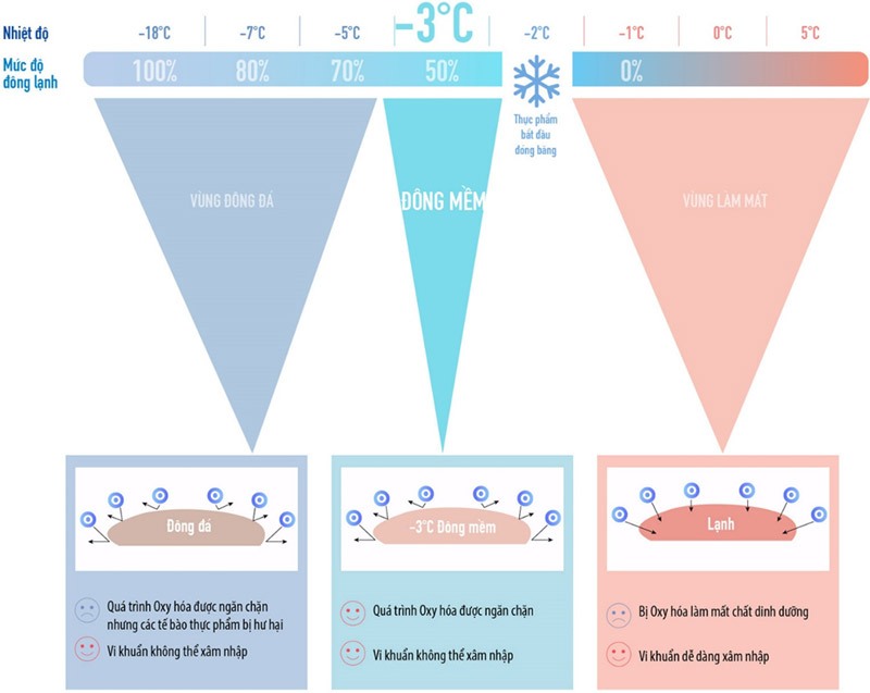 Biểu đồ nhiệt độ trên đã thể hiện rằng, từ 0 độ C đến -1 độ C là mức nhiệt nằm trong vùng làm mát, không thể tạo được lớp đông nhẹ, từ đó khó mà ngăn chặn hiệu quả sự oxy hóa và xâm nhập của vi khuẩn. Đây chính là nguyên nhân gây hư hại thực phẩm và khiến bạn phải đi chợ nhiều lần trong một tuần thay vì bảo quản số lượng lớn thực phẩm.
