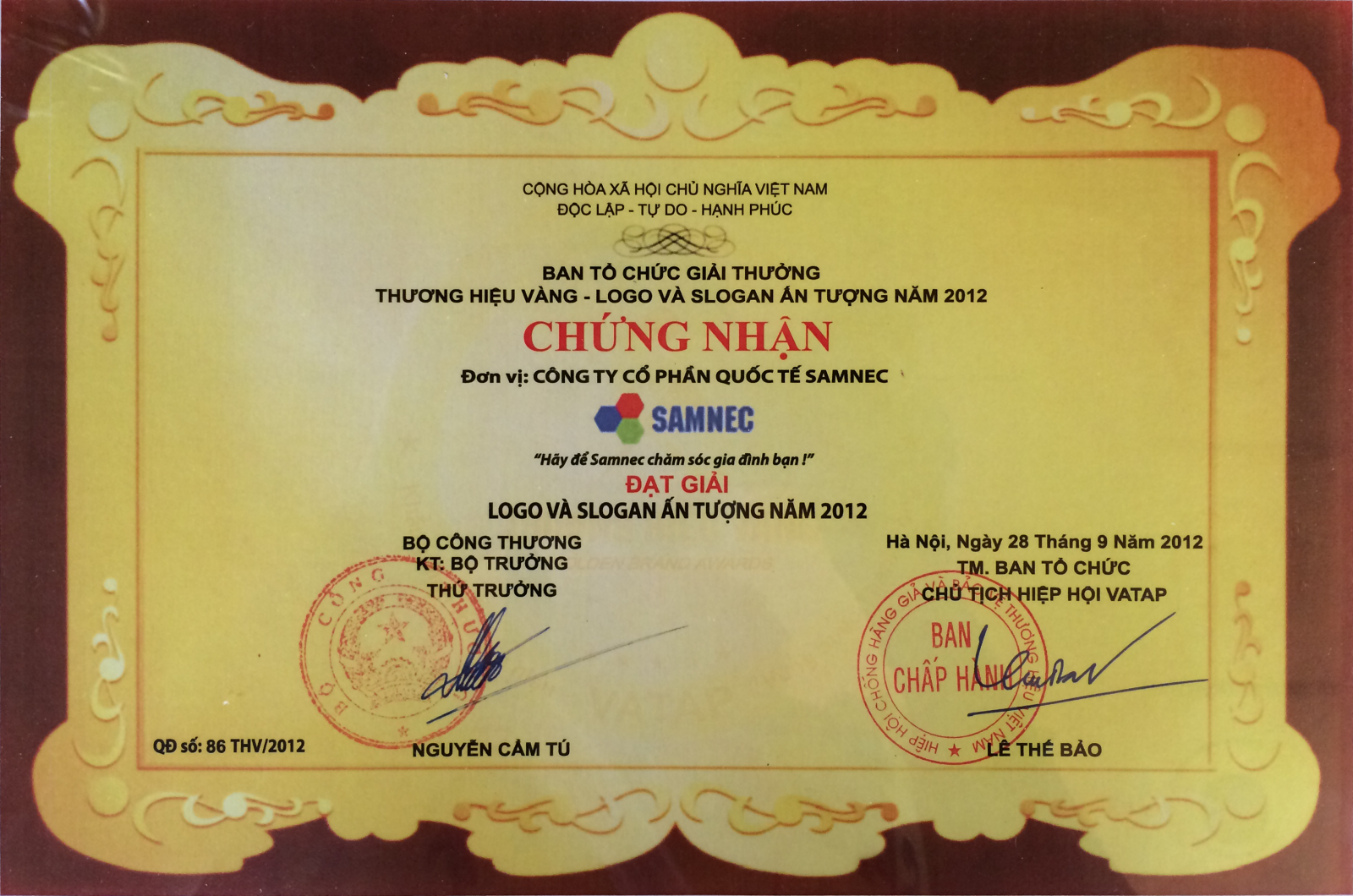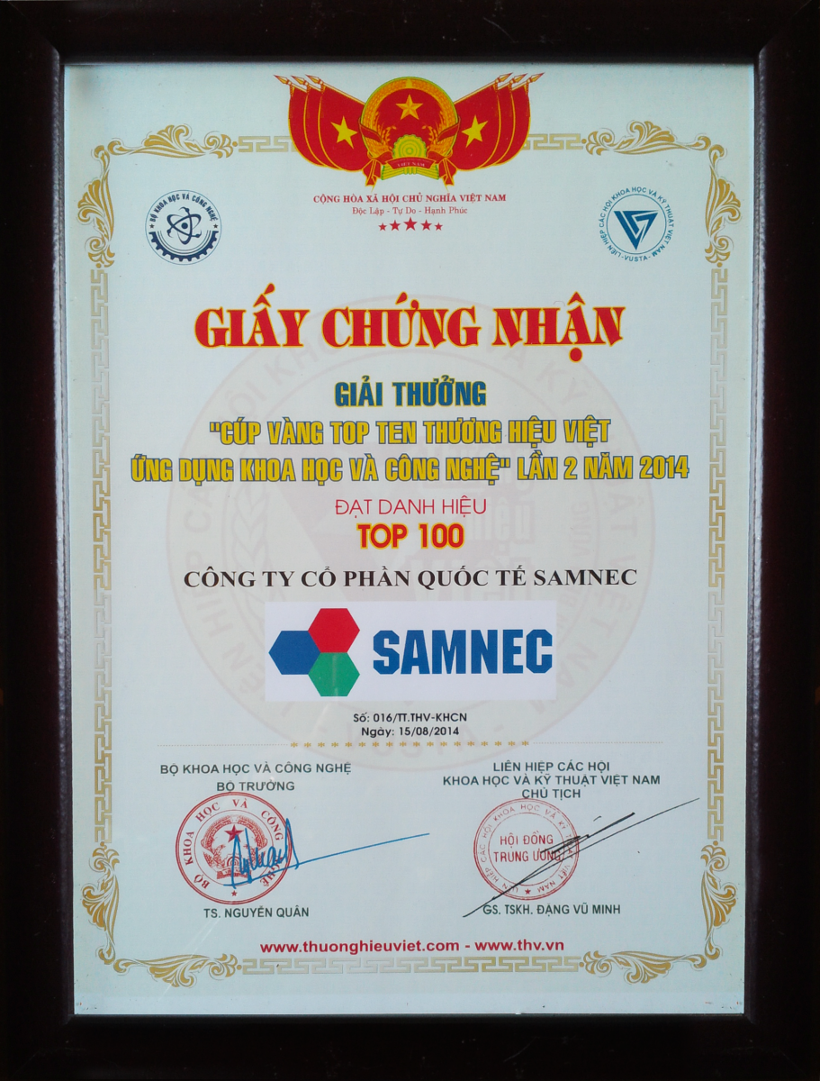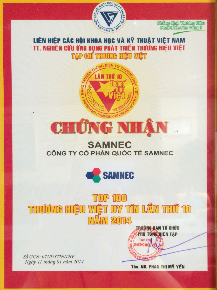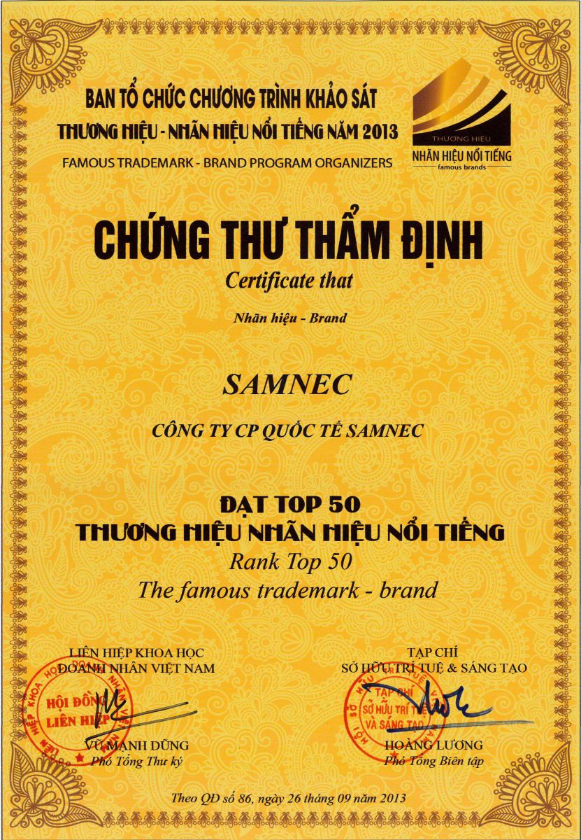- Chứng nhận: Top 50 nhãn hiệu - thương hiệu nổi tiếng - Cấp ngày: - Được cấp bởi: |