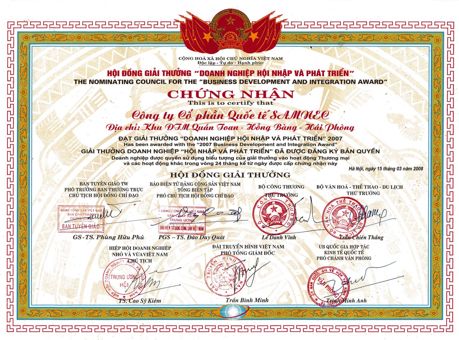 - Chứng nhận: Doanh nghiệp hội nhập và phát triển - Cấp ngày: - Được cấp bởi: |