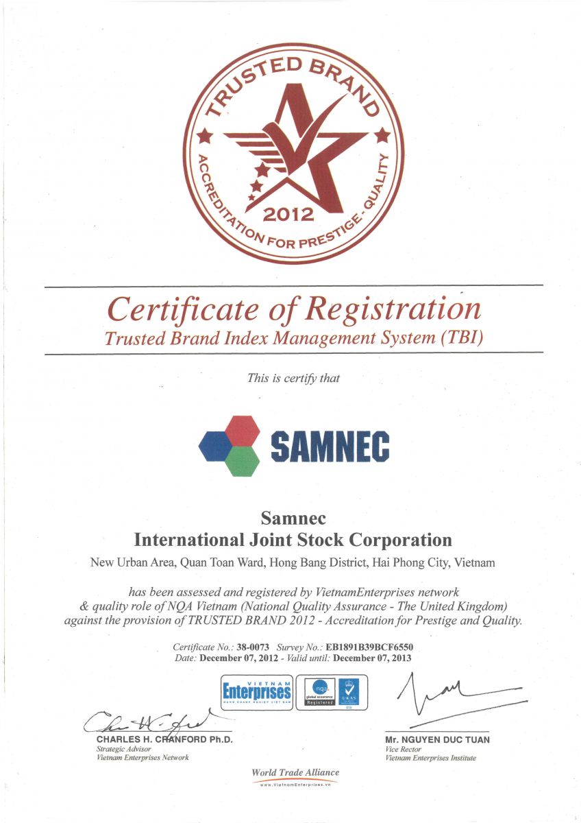 - Chứng nhận: Đảm bảo chất lượng - QAS 2017 (TOP for business excellence). - Số: VN-QAS-028-06/17 - Cấp ngày: 22/06/2017 - Được cấp bởi: GLOBAL GTA |