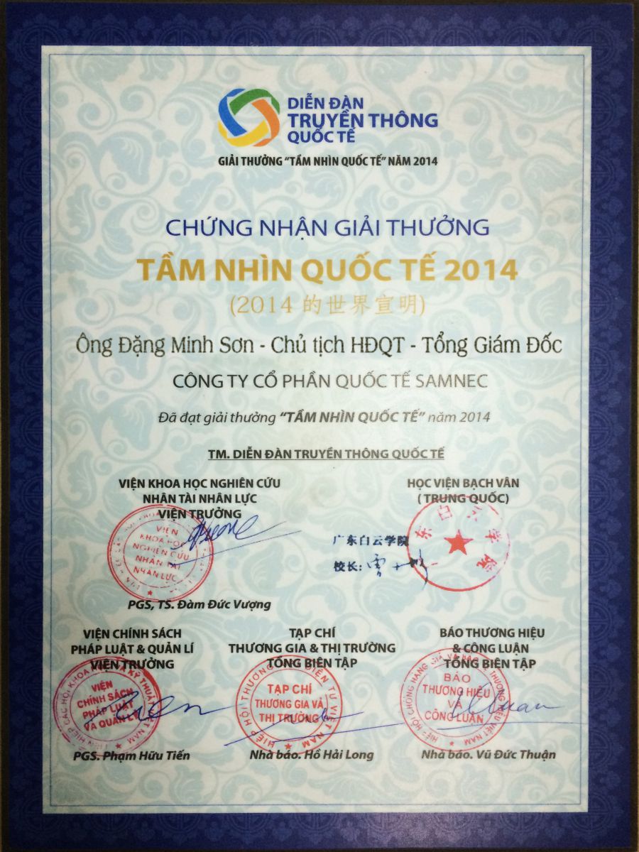 - Chứng nhận: Tầm nhìn quốc tế - Cấp ngày: - Được cấp bởi: |