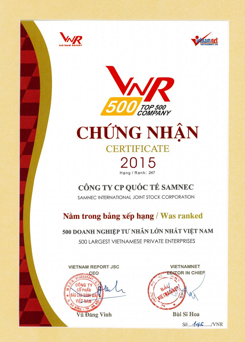 - Chứng nhận: 500 doanh nghiệp tư nhân lớn nhất Việt Nam - Cấp ngày: - Được cấp bởi: |