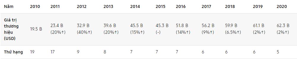 Khi Interbrand bắt đầu công bố danh sách này vào năm 2000, Samsung ở vị trí thứ 43. Và kể từ khi lọt top 10 với vị trí thứ 9 vào năm 2012, từ năm 2017, hãng đứng liên tục giữ vị trí thứ 6 suốt 3 năm và năm nay đã lọt vào Top 5.
