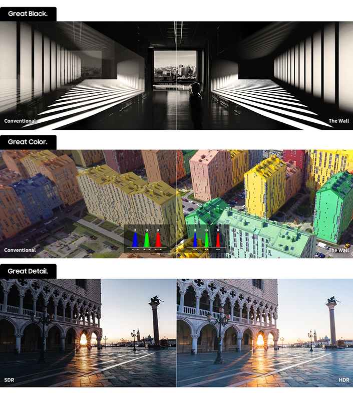 The Wall, dòng màn hình MicroLED theo kiểu mô-đun đầu tiên trên thế giới với kích thước 146 inch cùng khoảng cách pitch điểm ảnh 0,8mm có khả năng thể hiện sắc đen tuyền cũng như những màu sắc tinh khiết cùng độ sáng và độ tương phản ấn tượng. Nhờ đó, The Wall tạo ra hình ảnh hết sức chân thực và một trải nghiệm xem chìm đắm. Được vinh dự nhận giải thưởng “Sản Phẩm Mới Tốt Nhất” trong hạng mục Nghe Nhìn/ Rạp Hát tại gia tại CEDIA 2018, The Wall còn sở hữu công nghệ HDR10+ cho độ sáng tối đa, màu sắc và độ tương phản nâng cao trong mỗi khung hình.