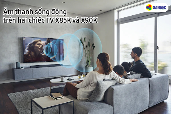 Tivi X85K có khả năng phát hiện các vật thể làm xáo trộn đường đi của âm thanh, từ đó tối ưu hóa để thay đổi âm thanh tùy thuộc theo môi trường trong phòng, đây là tính năng thông minh giúp người xem được sống trọn từng khoảnh khắc âm thanh. Còn điểm cộng của chiếc tivi X90K là khả năng cảm biến không gian và con người để tự động hiệu chỉnh âm thanh phù hợp với vị trí người nghe.