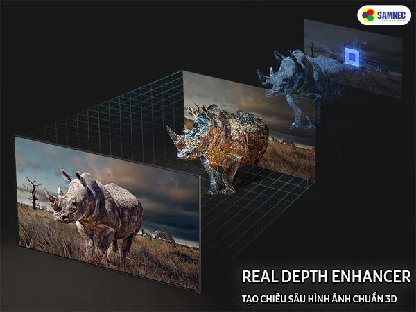Samsung còn tài tình trong việc kết hợp công nghệ hiệu chỉnh âm thanh theo chuyển động hình ảnh (OTS Lite) và không gian (Spacefit Sound) giúp bạn trải nghiệm âm thanh tối ưu, chân thực mà vẫn linh hoạt trong việc sắp xếp vị trí nội thất gia đình. Công nghệ AI trên chiếc tivi này được sử dụng một cách triệt để giúp người dùng luôn được đắm chìm trong thế giới âm thanh và hình ảnh sống động.