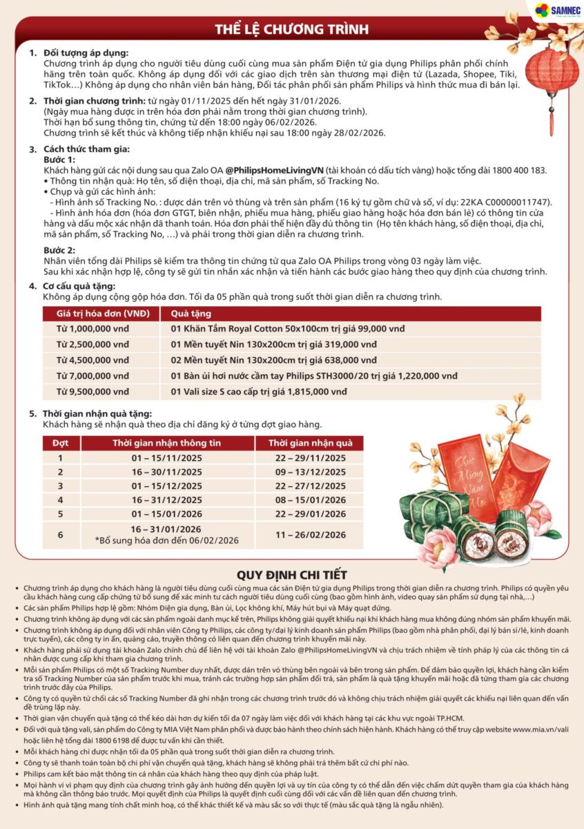 Từ 01/11/2025 đến 31/01/2026, khách hàng mua sắm sản phẩm Philips tại Hệ thống Điện máy Samnec sẽ có cơ hội tham gia chương trình "Đến Samnec Tết Ấm Êm, Thêm Quà Thêm Hên Cùng Philips".