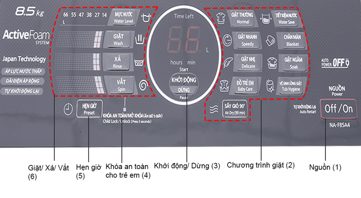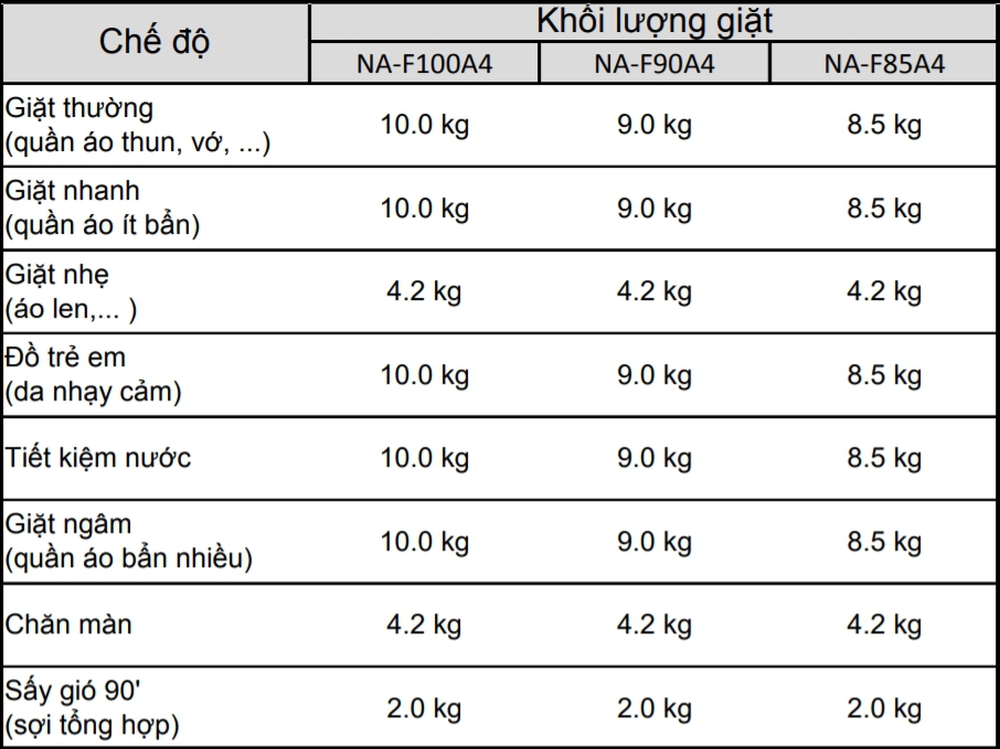 Lưu ý: Với dòng NA-F100A4 là 72 lít, NA-F90A4 là 69 lít và NA-F85A4 là 66 lít.