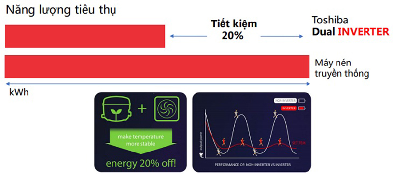 - Tiết kiệm 20% - 45% điện năng so với tủ lạnh thường cùng dung tích: Với Dual Inverter, tủ lạnh Toshiba sẽ được vận hành ổn định, tiết kiệm đến 20% -45% điện tiêu thụ so với tủ lạnh sử dụng máy nén thông thường.