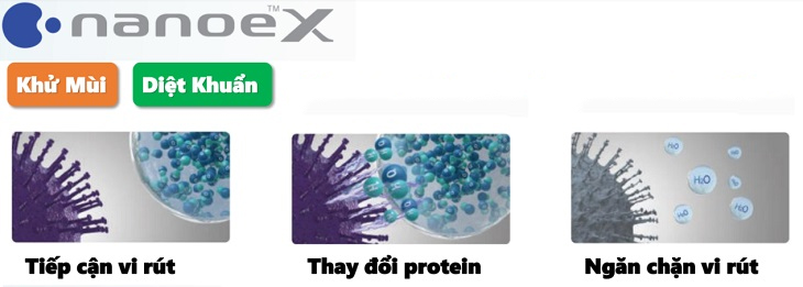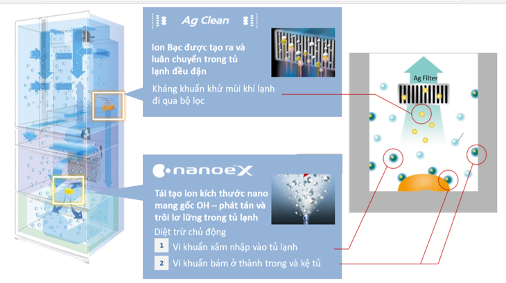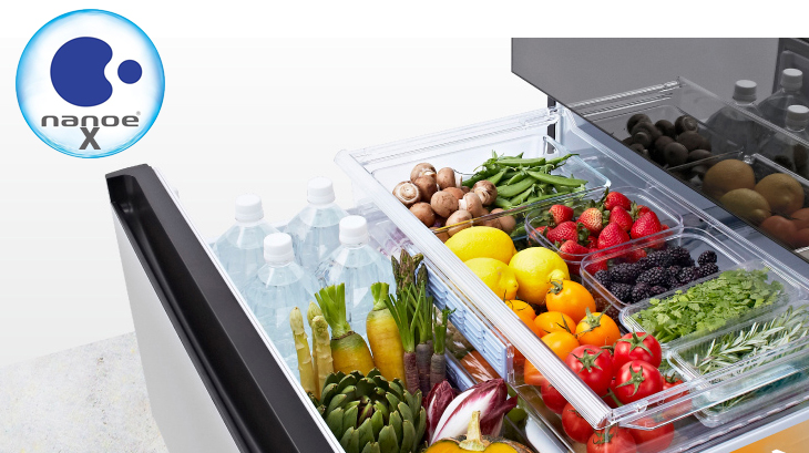 Nanoe-X là các ion cỡ nano sinh ra từ độ ẩm trong không khí chứa 4,8 nghìn tỷ phân tử nước(OH) có tác dụng tiêu diệt vi khuẩn. Chúng được phát tán đến mọi ngóc ngách bên trong tủ lạnh để giữ cho thực phẩm tươi mới và sạch khuẩn.
