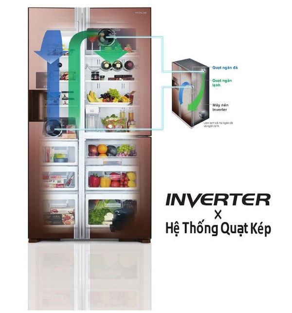 Khác với các dòng tủ lạnh thông thường chỉ được sử dụng một quạt, không thể cung cấp đủ không khí lạnh cho cả ngăn đá và ngăn mát. Tủ lạnh Hitachi được trang bị hệ thống quạt kép có khả năng làm lạnh độc lập, bằng cách thiết kế hai quạt gió riêng biệt cho ngăn đá và ngăn mát nhưng vẫn sử dụng chung một máy nén, khí lạnh được luân chuyển từ ngăn đá xuống ngăn mát rồi luân chuyển lên trên. Hệ thống làm lạnh tiên tiến này giúp từng ngăn trong tủ được làm lạnh đồng đều, đến mọi ngóc ngách trong ngăn tủ, đảm bảo thực phẩm được bảo quản một cách hiệu quả nhất