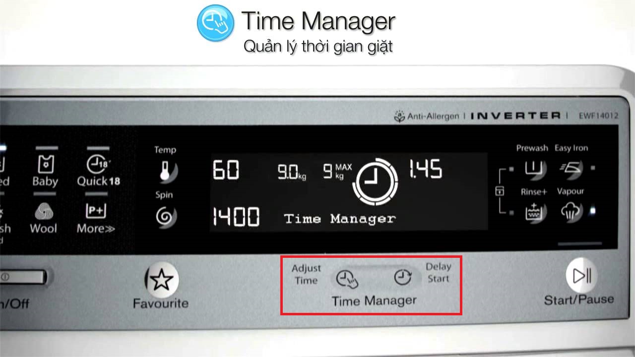 Ở Time Manager có một điểm đặc biệt vô cùng "đỉnh" đó là người tiêu dùng có thể tùy chọn tăng/giảm thời gian giặt sao cho phù hợp với khối lượng, mức độ bẩn của quần áo cần giặt tại mọi chương trình giặt - một điều mà tính năng hẹn giờ giặt thông thường không làm được.