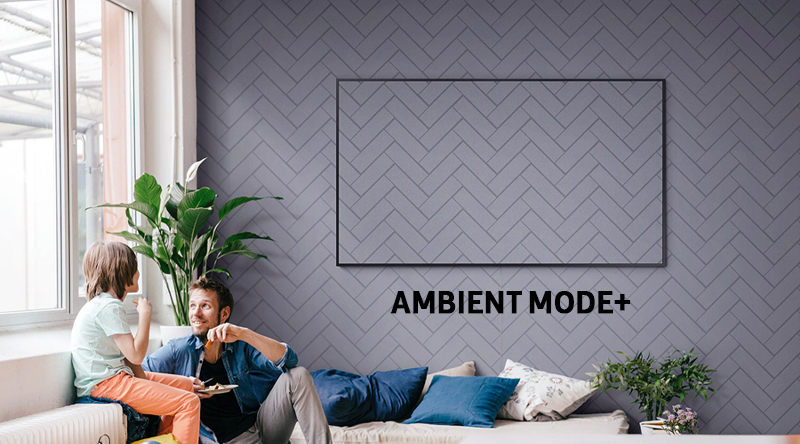 Chế Độ Ambient Mode+, với chế độ Ambient Mode, bạn có thể thiết lập những thông tin hữu ích về thời gian, thời tiết hay tin tức ngay trên màn hình. Hoặc để The Frame hòa trộn hài hòa với họa tiết và màu sắc không gian xung quanh, mang đến góc nhìn độc đáo và mới lạ.