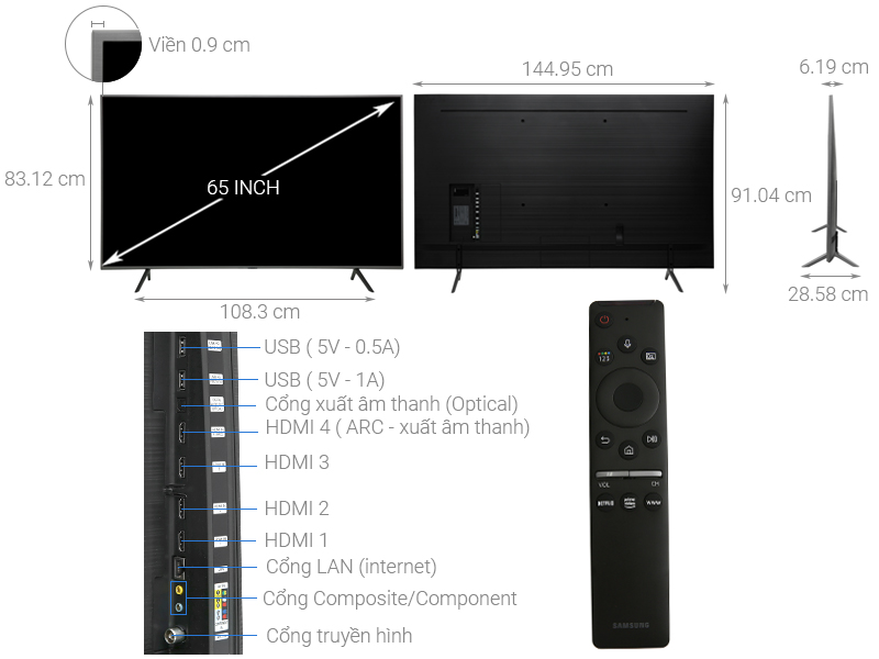 Kích thước tivi 65 inch vừa phải, thích hợp bố trí vào nhiều không gian nội thất khác nhau như phòng họp, phòng khác, phòng ngủ,... Chân đế dạng chữ V sáng bóng, chắc chắn, giúp tivi đứng vững trên nhiều dạng bề mặt phẳng khác nhau.