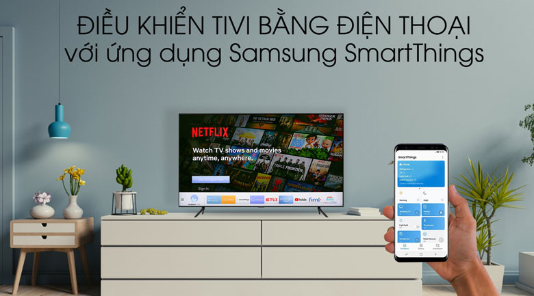 Điều khiển tivi thông minh bằng remote đa nhiệm - One Remote và điều khiển bằng điện thoại qua ứng dụng SmartThings.