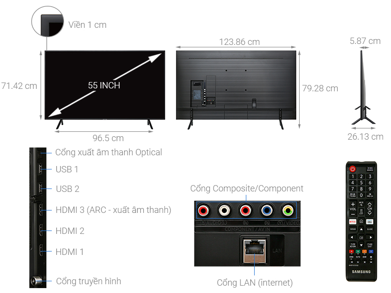 Kích thước màn hình 55 inch vừa phải phù hợp với nhiều không gian nội thất khác nhau như: phòng khách, phòng họp,...