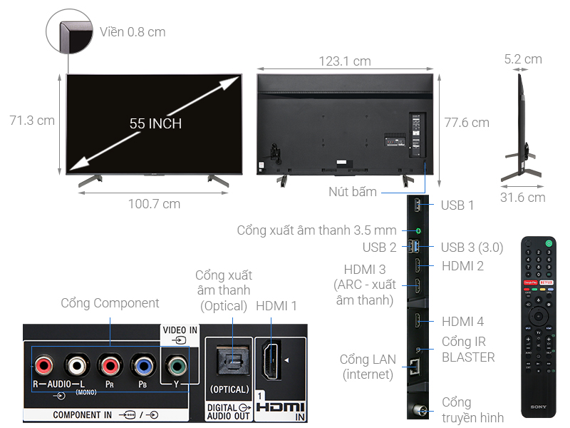 Netflix Calibrated Mode, Hiệu chỉnh màu sắc chuẩn CalMAN, Edge LED Frame Dimming, Dolby Vision, Triluminos, HLG, HDR10, 4K X-Reality PRO, 4K HDR X1™