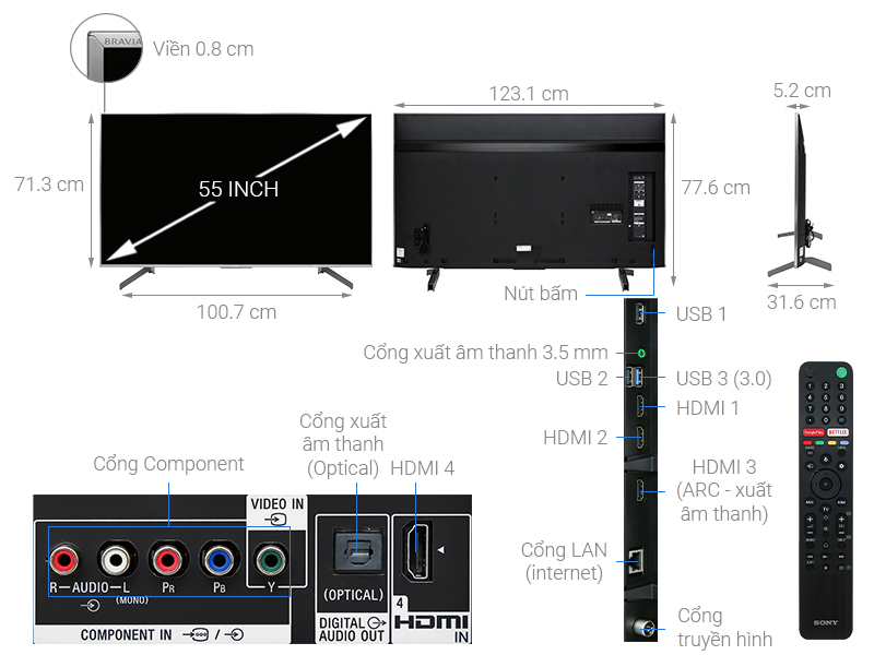 Netflix Calibrated Mode, Hiệu chỉnh màu sắc chuẩn CalMAN, Edge LED Frame Dimming, Dolby Vision, Triluminos, HLG, HDR10, 4K X-Reality PRO, 4K HDR X1™