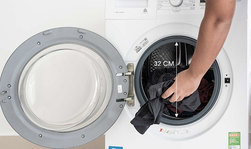Đường kính cửa rộng lên đến 32cm giúp người dùng dễ quan sát, cho quần áo vào.