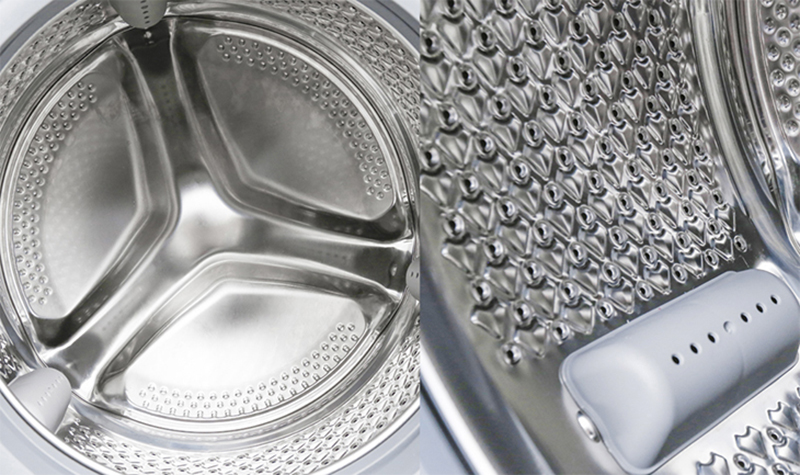 Mâm giặt và lồng giặt được làm từ thép không gỉ, sáng bóng, sạch sẽ, bền bỉ.