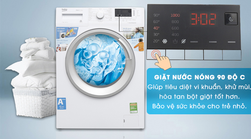 Giặt nước nóng: Máy hỗ trợ giặt nước nóng lên đến 90 độ C, giúp diệt vi khuẩn, làm mềm vải, bảo vệ an toàn cho làn da nhạy cảm của trẻ.