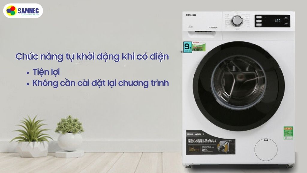 Đặc biệt, máy giặt Toshiba còn có chức năng tự khởi động khi có điện. Trong trường hợp nếu như bạn đang dùng máy giặt mà bị cúp điện, đừng lo lắng bạn sẽ phải cài đặt lại chương trình giặt.
