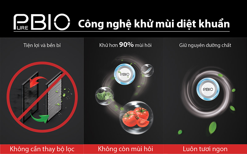 Công nghệ Pure Bio với hệ thống Plasma tạo ion âm để tiêu diệt vi khuẩn và mùi hôi, đặc biệt là mùi ethylen từ rau quả giúp đảm bảo an toàn cho sức khỏe và giữ thức ăn tươi lâu hơn trong suốt quá trình bảo quản.