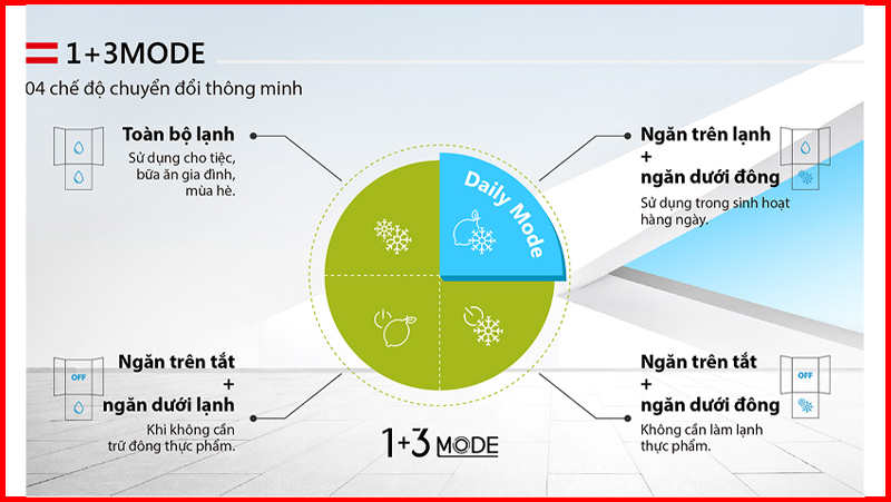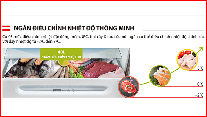 Có 3 mức điều chỉnh nhiệt độ: đông mềm, 0°C, trái cây & rau củ, mỗi ngăn có thể điều chỉnh nhiệt độ chính xác với dãy nhiệt độ từ -2°C đến 3°C