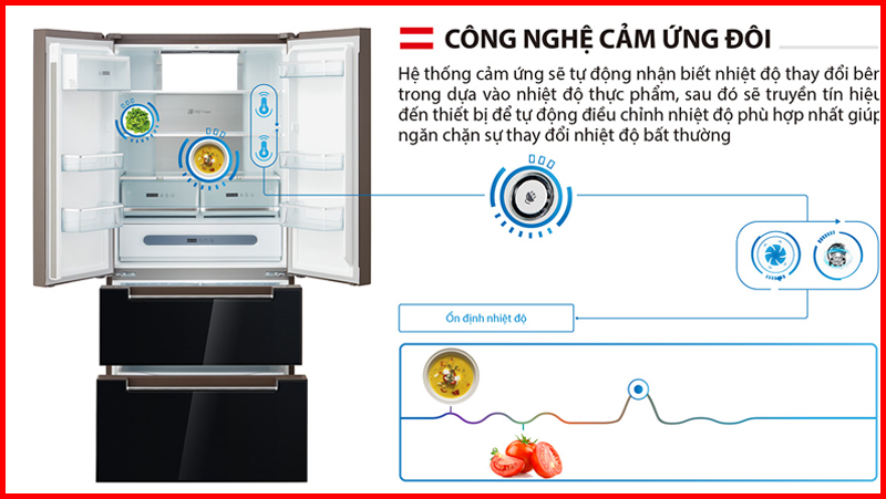 Hệ thống cảm ứng sẽ tự động nhận biết nhiệt độ thay đổi bên trong dựa vào nhiệt độ thực phẩm, sau đó sẽ truyền tín hiệu đến thiết bị để tự động điều chỉnh nhiệt độ phù hợp nhất giúp ngăn chặn sự thay đổi nhiệt độ bất thương.