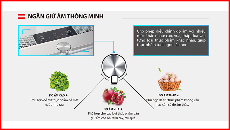 Ngăn giữ ẩm này cho phép điều chỉnh độ ẩm với nhiều mức khác nhau cao, vừa, thấp dựa vào từng loại thực phẩm khác nhau giúp thực phẩm tươi ngon lâu hơn.