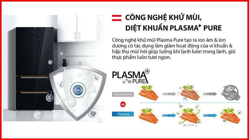 Ở chiếc tủ lạnh Toshiba Inverter 500 Lít GR-RF532WE-PGV, công nghệ Plasma Pure sẽ có khả năng tạo ra các ion dương và ion âm trong môi trường không khí lạnh. Các ion này thì sẽ xâm nhập vào vi khuẩn và ở trên bề mặt tế bào vi sinh vật có ở bên trong tủ, gây mất khả năng hoạt động của chúng, giúp kháng khuẩn, khử mùi hiệu quả, và trả lại bầu không gian trong lành, không bám mùi hôi khó chịu cho tủ lạnh.