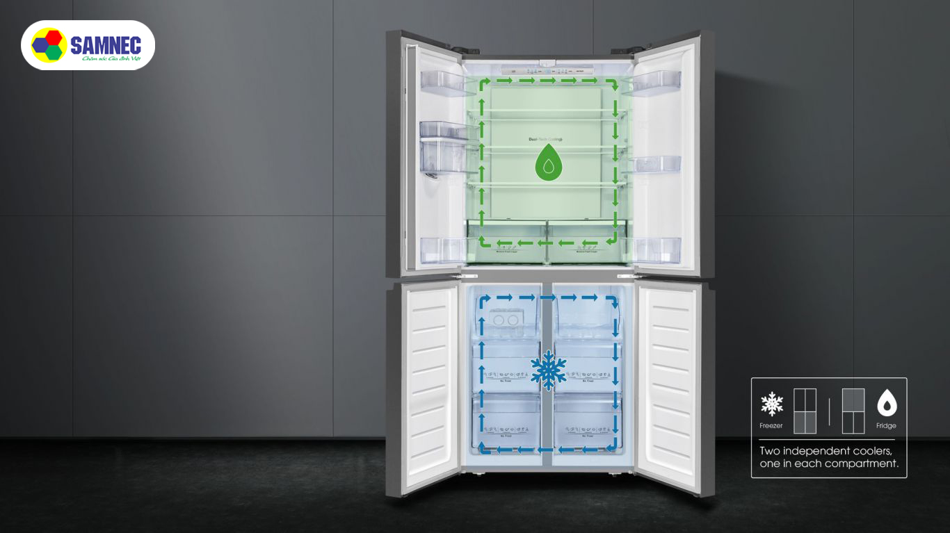 Công nghệ 2 dàn độc lập được trang bị trên các mẫu tủ lạnh nhiều cửa Casper. Đây là công nghệ mà bố trí nhiệt độ riêng biệt cho ngăn đông và ngăn mát, duy trì độ ẩm phù hợp và hạn chế tình trạng lẫn mũi giữa thực phẩm của các ngăn.