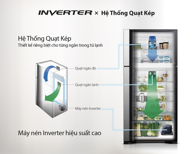+ Hệ thống quạt làm lạnh kép: Tủ lạnh có 2 quạt gió trang bị riêng biệt và làm lạnh độc lập cho ngăn đông và ngăn mát giúp hơi lạnh luân chuyển đều khắp tủ.