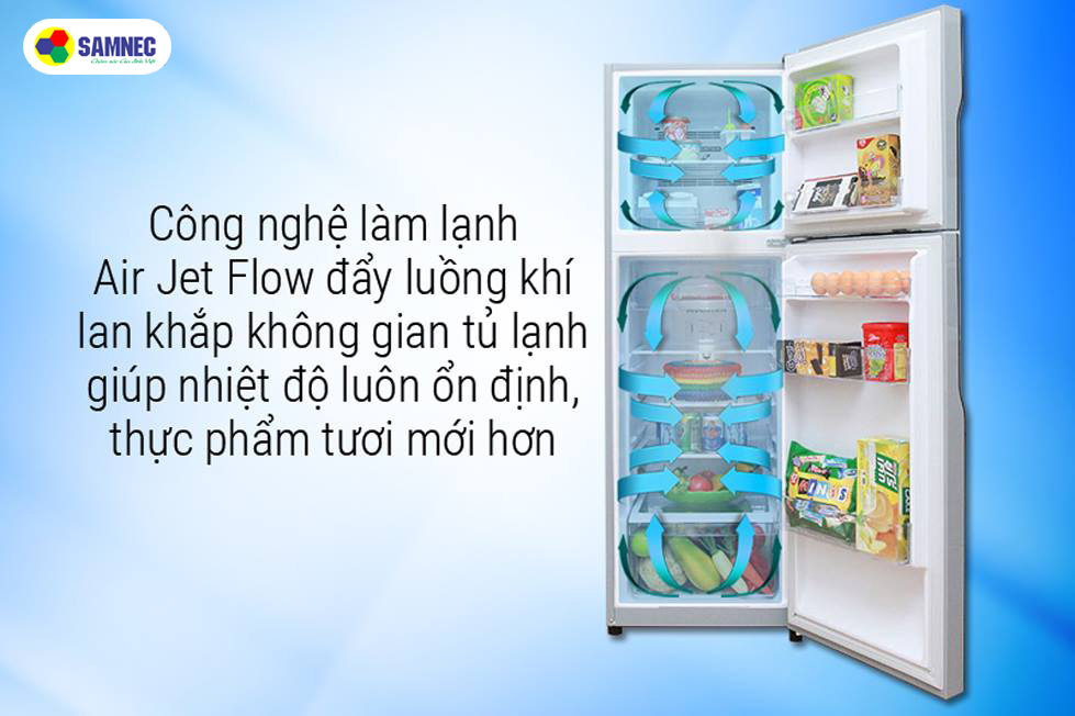 Công nghệ làm lạnh Air Jet Flow được trang bị cho các dòng tủ lạnh Hitachi có dung tích nhỏ dưới 300 lít, sử dụng các ô thông gió đẩy khí lạnh luân chuyển khắp các ngăn tủ giúp làm lạnh hiệu quả.