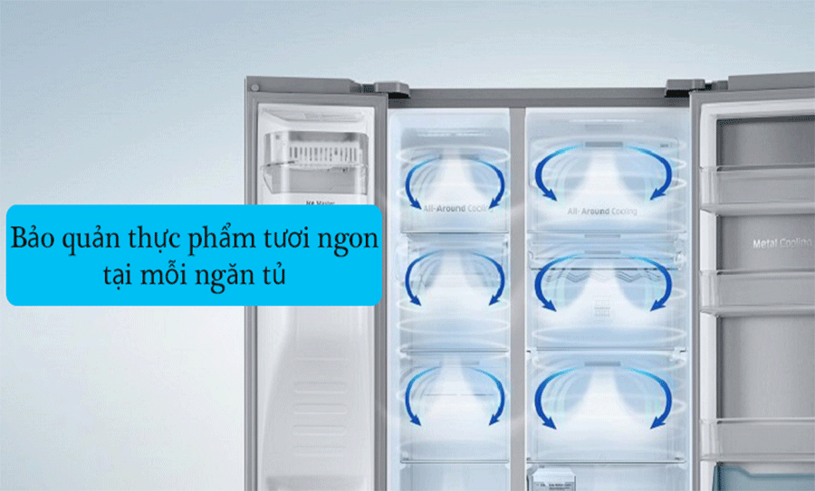 Nhờ công nghệ làm lạnh vòm All-around Cooling, các luồng khí lạnh sẽ tỏa ra bên trong tủ lạnh theo dạng vòng cung, cho thực phẩm nhận được hơi lạnh đồng đều, nhanh chóng. Góp phần bảo quản được độ tươi ngon lâu cho những món thực phẩm của bạn.