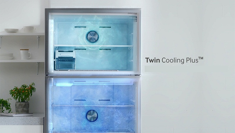 Công nghệ Hai dàn lạnh độc lập - Twin Cooling System Plus đời mới hiện đại trên tủ lạnh Samsung sử dụng 2 quạt gió để làm lạnh riêng biệt cho ngăn đông và ngăn mát. Đặc biệt, hệ thống này được cải tiến hơn khi chỉ sử dụng một máy nén duy nhất, giúp tăng hiệu quả làm lạnh nhưng vẫn tiết kiệm năng lượng.