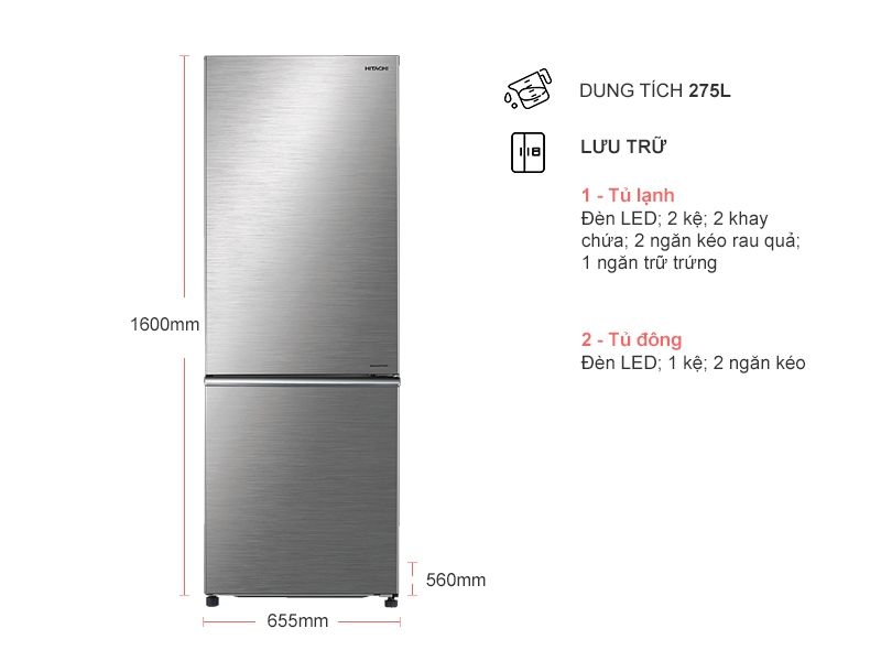 Là chiếc tủ lạnh ngăn đá dưới mang lại sự tiện dụng cho người dùng và với dung tích 275 lít với các khay kệ được sắp xếp hợp lý giúp bạn chứa được nhiều thực phẩm hơn. Chiếc tủ lạnh Hitachi này sẽ đáp ứng tốt cho gia đình có từ 3-5 thành viên sử dụng.