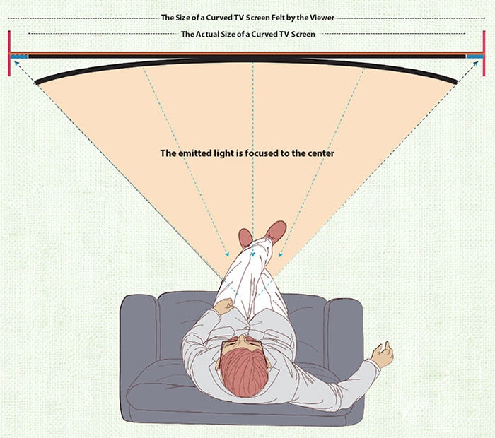 Màn hình cong sẽ làm cho khoảng cách từ mắt người xem đến màn hình là như nhau tại mọi điểm trên chiều ngang, vì vậy khi xem tivi màn hình cong thì bạn sẽ cảm thấy kích thước màn hình lớn hơn tivi thông thường, miễn là bạn ngồi đúng vị trí và khoảng cách phù hợp.