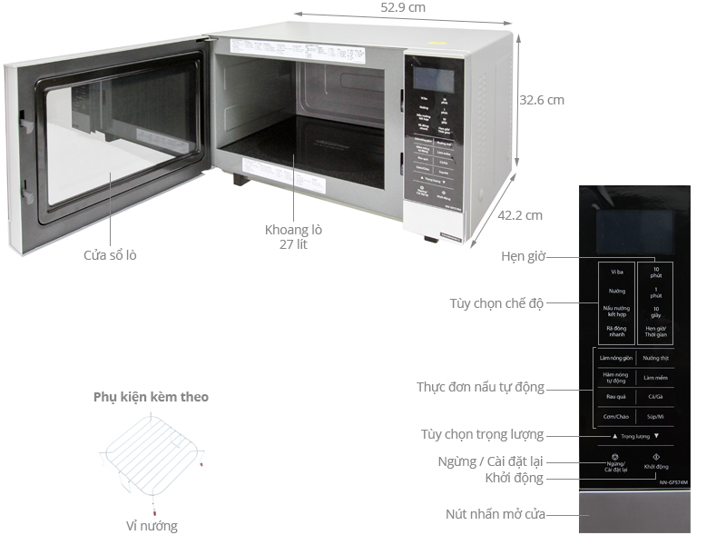 Hẹn giờ nấu, Chuông báo khi nấu xong, Khoang lò có đèn, Khoá bảng điều khiển tự động, Lò không dùng đĩa xoay, Inverter tiết kiệm điện