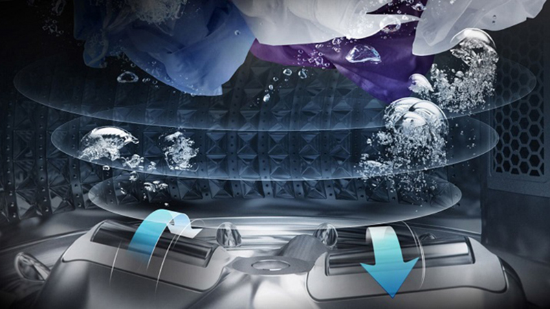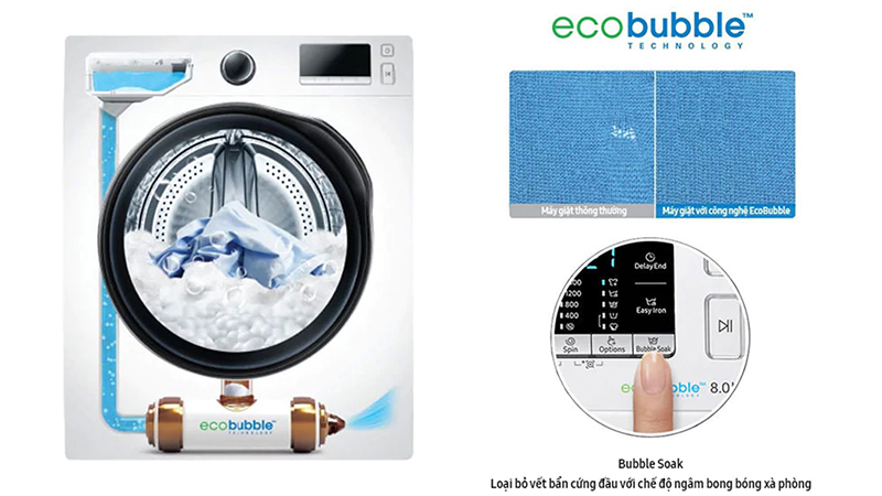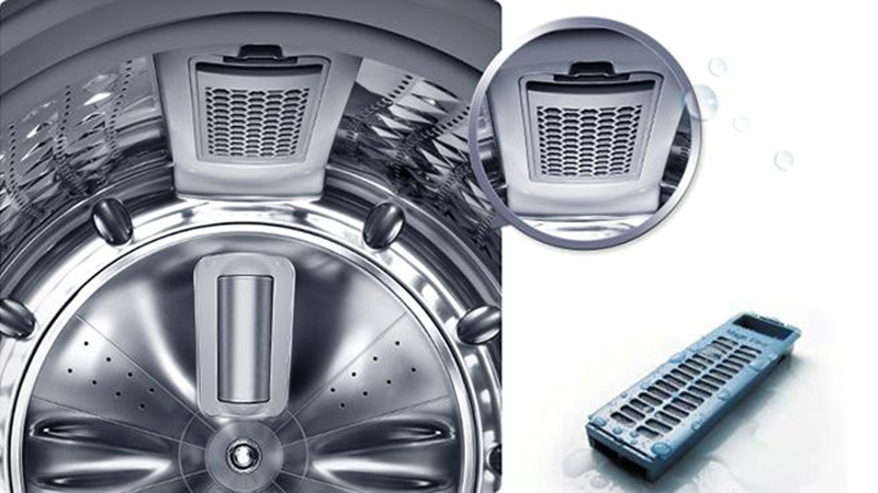 Trước khi bắt đầu thao tác giặt, 1 thiết bị tạo bong bóng hòa tan bột giặt vào nước và bơm khí vào tạo ra nhiều bọt xà phòng. Bọt xà phòng thấm nhanh và sâu vào từng sợi vải, làm sạch các vết bẩn trên quần áo của bạn ngay cả với các vết bẩn thông dụng như rượu, tương cà, sô cô la, bùn đất và các loại vết bẩn khó giặt khác. Công nghệ giặt bong bóng này còn giúp tiết kiệm điện tối đa khi có thể giặt đồ ở nhiệt độ thường mà không cần phải sử dụng đến nước nóng như các công nghệ cũ.