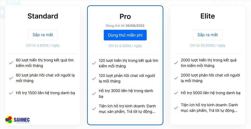 Cụ thể, gói trả phí dành cho doanh nghiệp (dạng tài khoản OA Doanh Nghiệp) sẽ bao gồm: Dùng thử (10.000 đồng), Nâng cao (59.000 đồng) và Cao cấp (399.000 đồng). Tất cả tính trên chu kỳ một tháng sử dụng. Tài khoản OA khi mua thuê bao tháng sẽ được "nới" một số tính năng, loại bỏ giới hạn về lượt hiển thị trong kết quả tìm kiếm, hỗ trợ danh bạ, phản hồi chat...